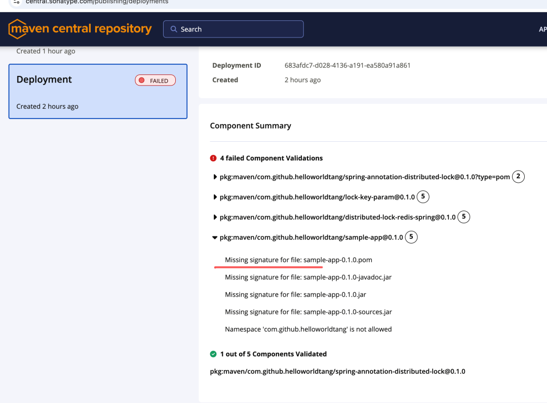 解决:确保 pom.xml 中的 groupId 与你在 Sonatype JIRA 上申请并获批的命名空间 完全一致(例如 io.github.helloworldtang)。Missing signature