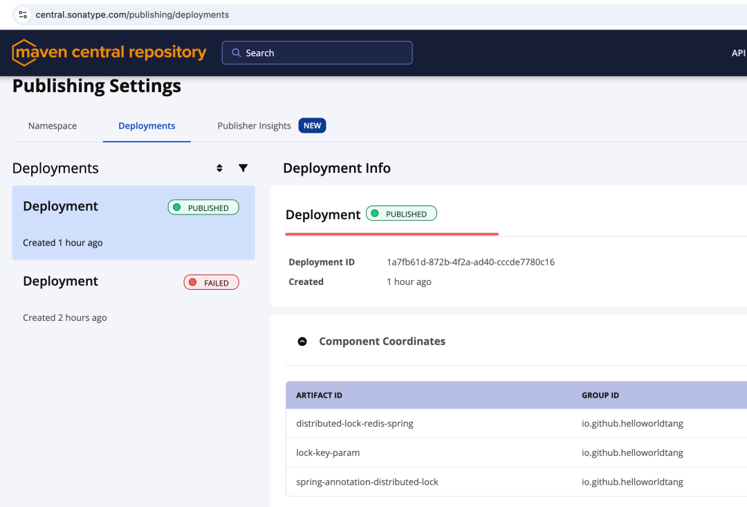 解决:Maven Central 不允许覆盖已发布的版本。如果需要更新,必须升级版本号(如 0.1.0 -> 0.1.1)。Activity 面板查看发布状态,通常会经历 PUBLISHING -> Published。