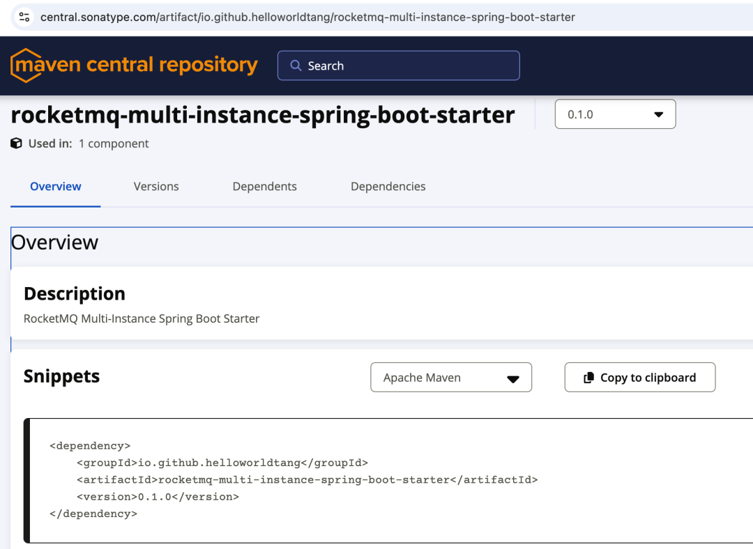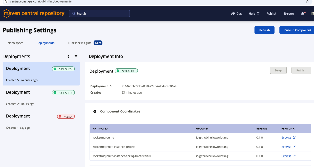 -pl rocketmq-multi-instance-spring-boot-starter -am deploy稍等片刻,你的组件便会出现在 Maven 中央仓库中。