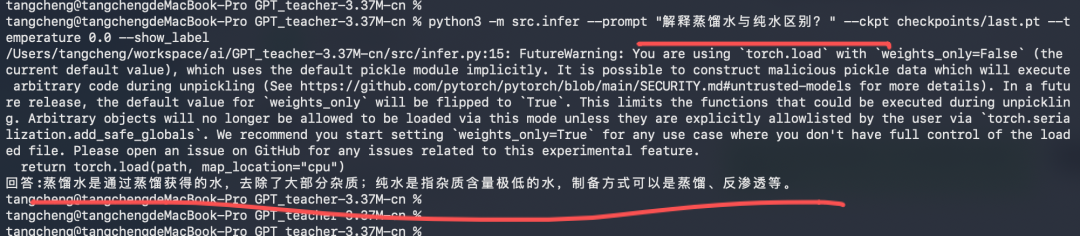 % python3 -m src.infer --prompt "解释蒸馏水与纯水区别?" --ckpt checkpoints/last.pt --temperature 0.0 --show_label输出的回答: