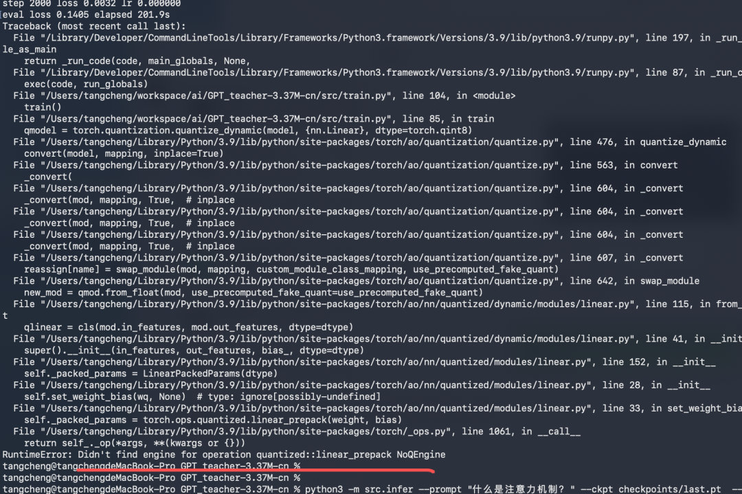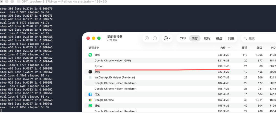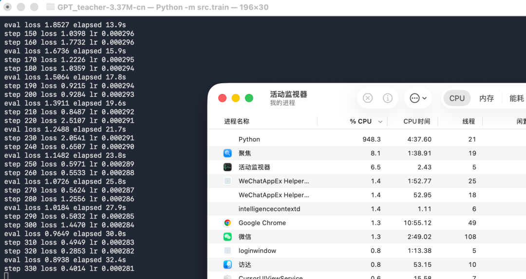 新设备训练一个可以回答问题的中文GPT小模型提速很多:平均200s。在19年的Mac Intel 2.6GHz 6c i7 16GB平均耗时1186.95s【19.78 分钟】。相同的任务,都是510条训练集90条验证集,用CPU训练2000步。