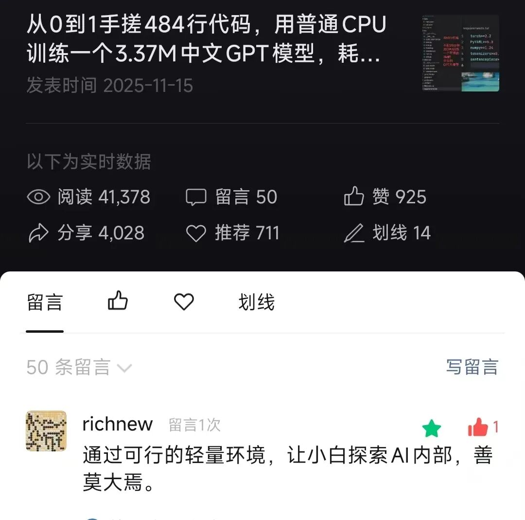从0到1手搓484行代码,用普通CPU训练一个3.37M中文GPT模型,耗时不到20分钟,回答的效果很不错,欢迎各位老师检查作业