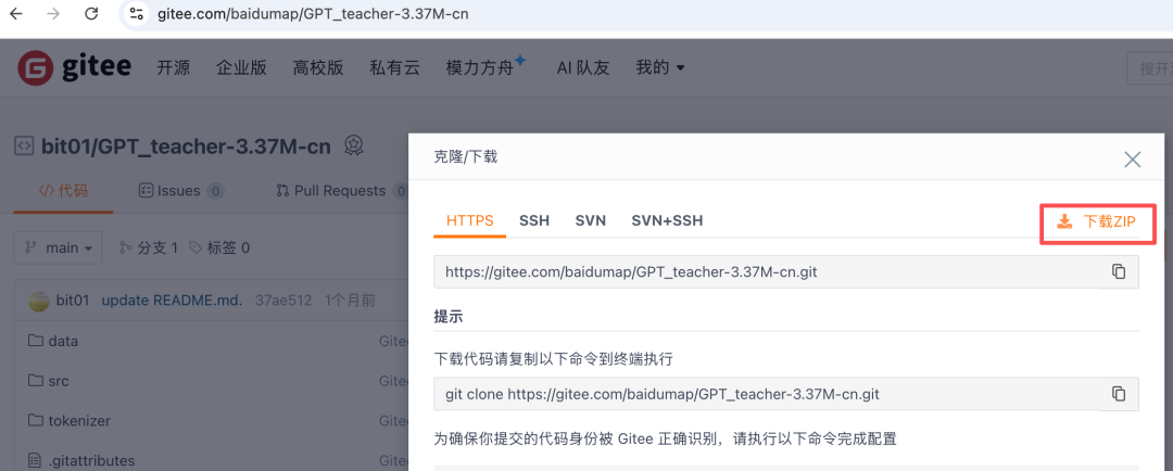 %git clone https://gitee.com/baidumap/GPT_teacher-3.37M-cn.git