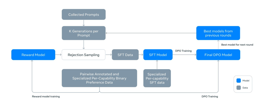 - 注:这里的奖励模型是用成对标注的偏好数据(Pairwise Annotated and Specialized Per-Capability Binary Preference Data)训练的,仅用于筛选数据,而非后续对齐的核心。