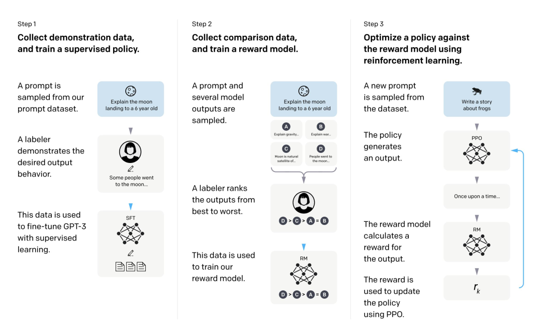 - 用这些「提示词 + 理想回答」的数据,通过监督学习(SFT)微调大模型(如 GPT-3)。
