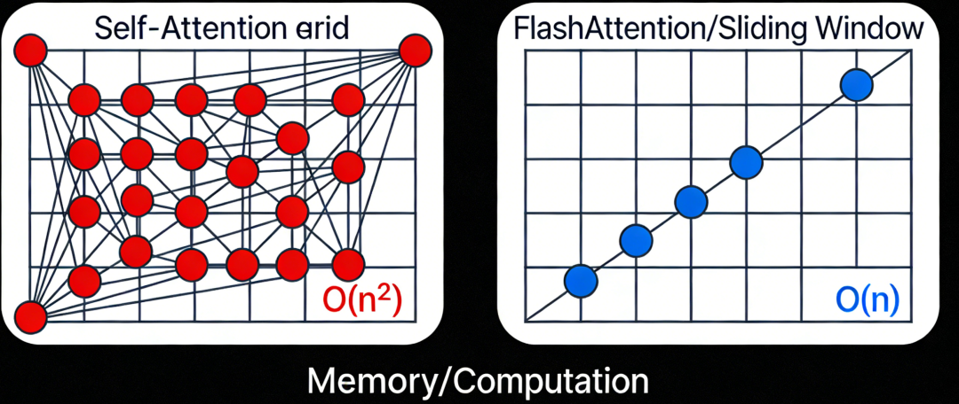 传统的自注意力机制时间复杂度是 O (n²),当 n 从 4k 扩展到 1M 时,计算量会爆炸式增长。为了支持长上下文,DeepSeek 等模型采用了以下优化: