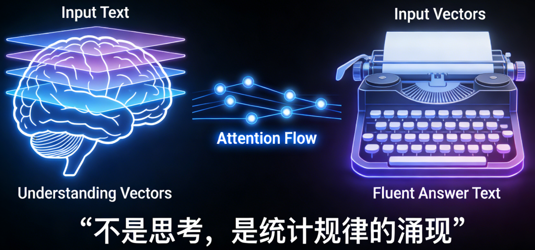 模型并不像人类那样拥有意识,但它通过数学运算捕捉到了语言中统计规律和结构。当你得到答案时,那并不是某个神经元在 “思考”,而是一系列精心设计的矩阵乘法、激活函数和注意力加权的结果。