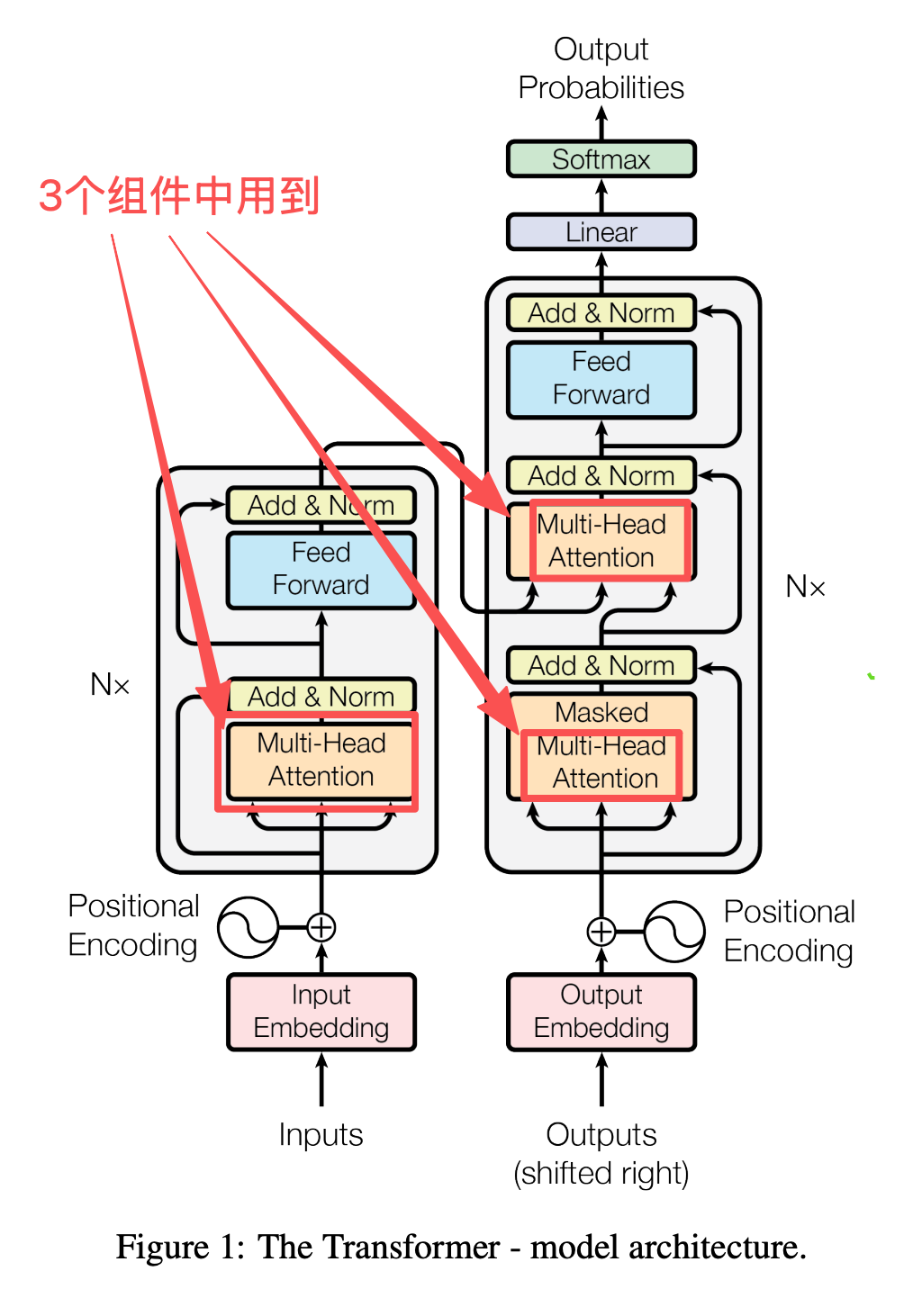 今天咱们就借着这个NLP翻译的例子,把多头注意力的核心意义讲透。在讲之前,先看下Transformer架构中哪些组件使用了多头注意力:
