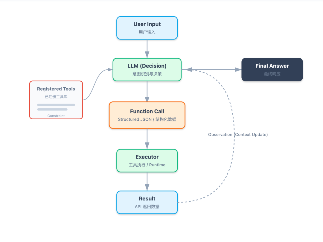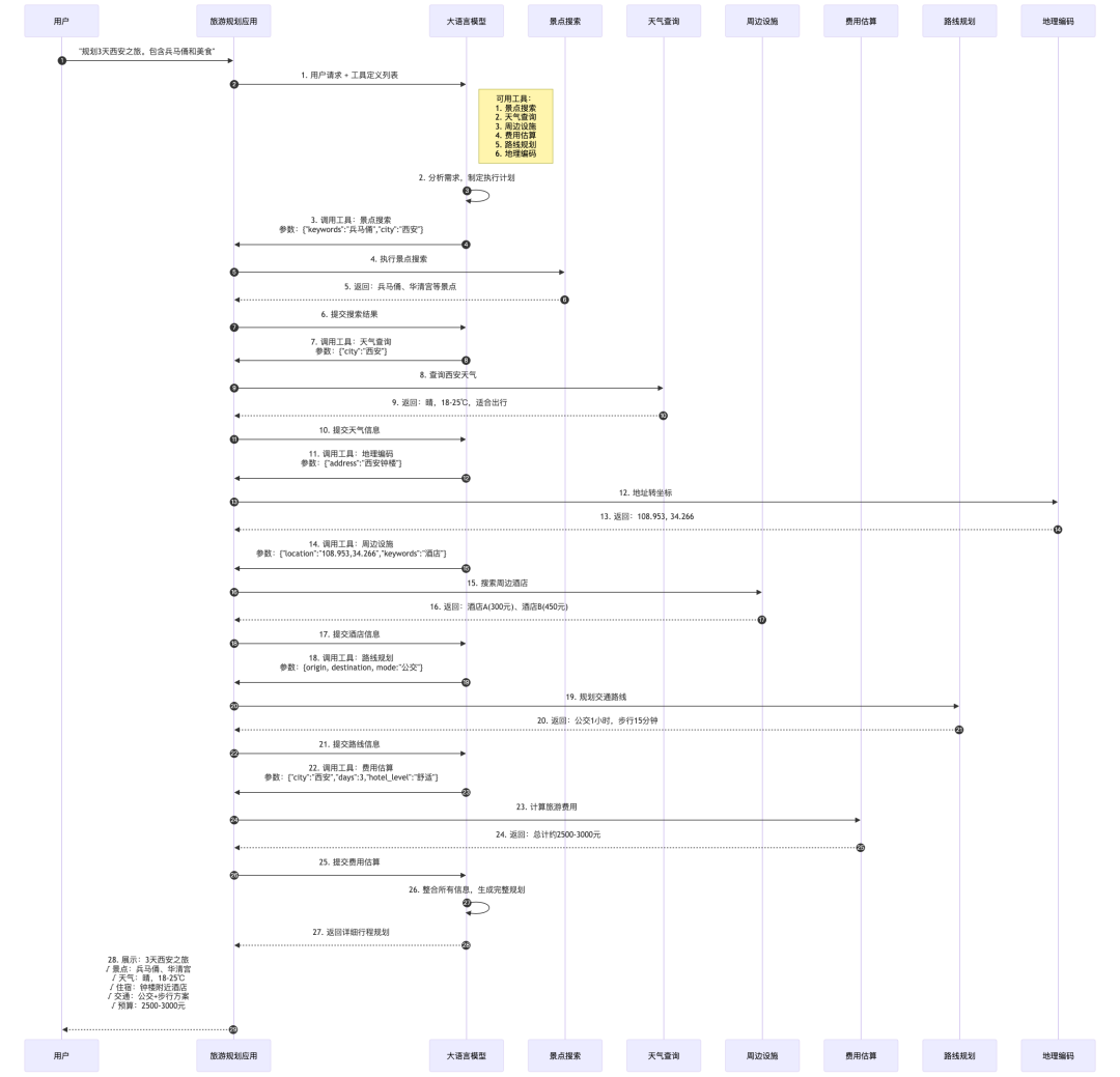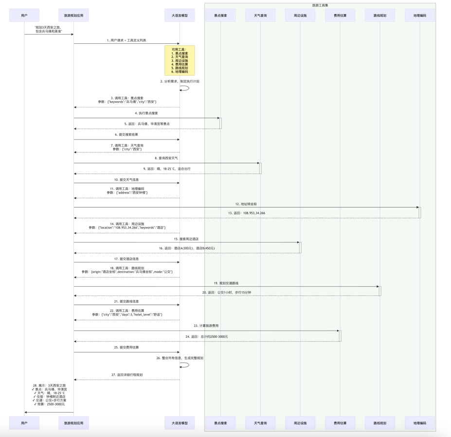大模型本身只能做文本理解和生成,无法直接访问数据或执行外部逻辑,例如查询天气、搜索景点、计算路线等。