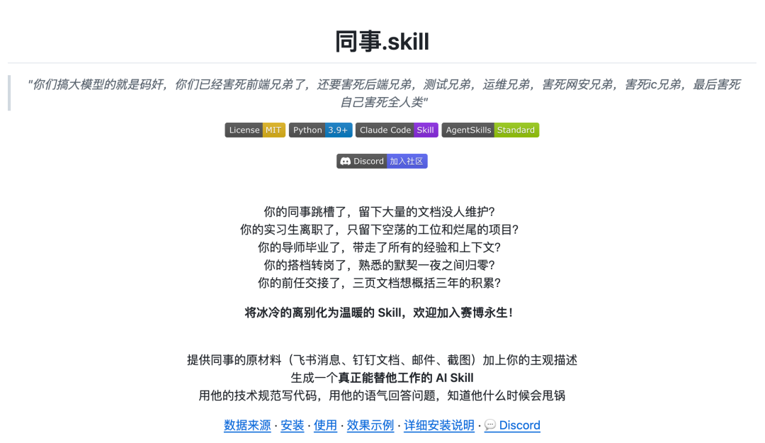 而「同事.skill」这类项目的意义,不在于它真的能完美复刻一个人,而在于它让我们开始思考:当一个人的经验可以被文本描述、被代码封装、被AI复刻,那经验的边界在哪里?