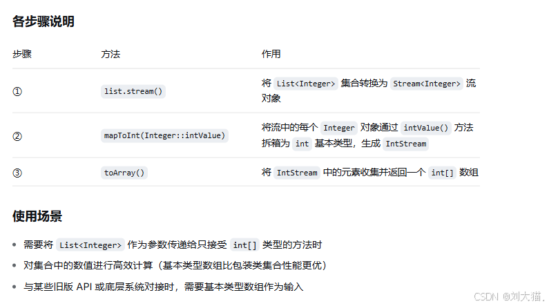 这段代码实现了 将 List<Integer> 转换为 int[] 数组 的功能,是 Java 中利用 Stream 流式操作进行类型转换的典型写法。