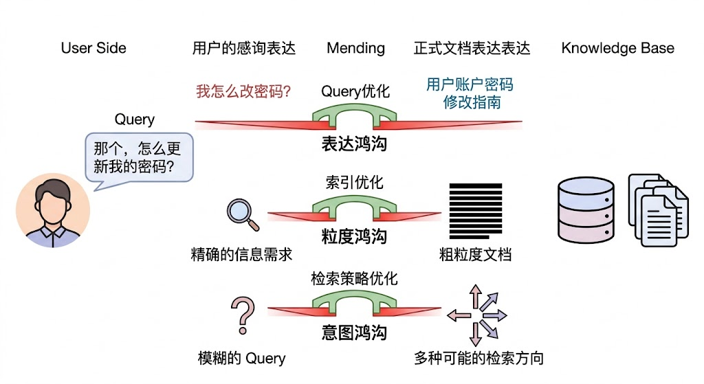 第三重是意图鸿沟。用户的 Query 往往是简短甚至模糊的,背后真正的信息需求并没有被完整表达出来。比如用户问"Transformer 的注意力机制",他到底是想了解原理?还是想看代码实现?还是想知道和 RNN 的对比?Query 本身没有给出足够的信息来精确定位检索方向。