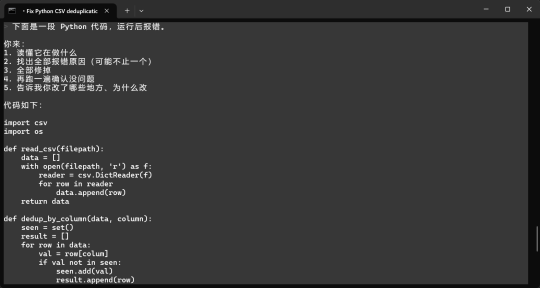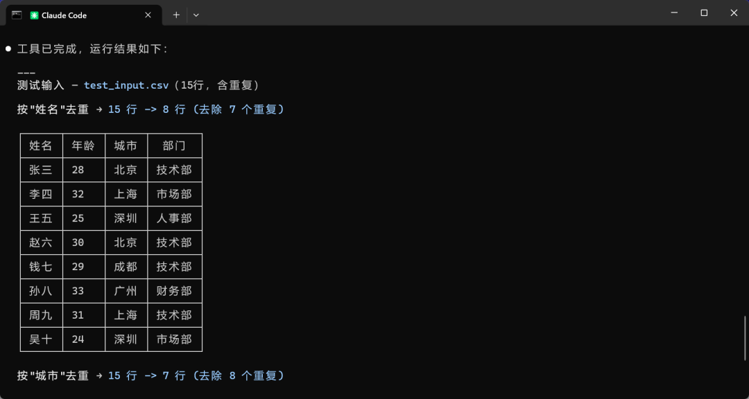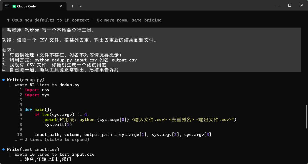 给它一个完整需求——写一个 CSV 去重命令行工具,没有现成文件,让它自己生成测试数据跑完整个流程。