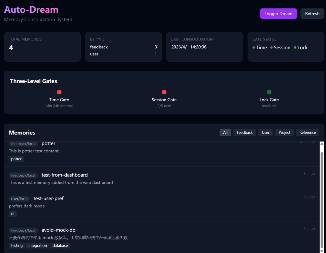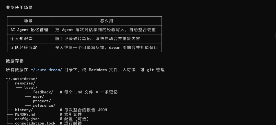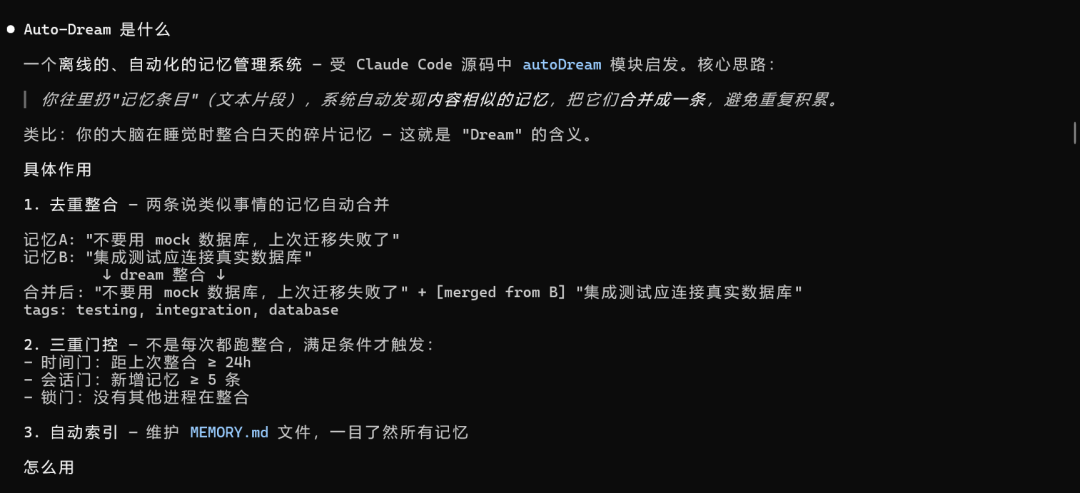 通过对 Claude Code 源码的全局分析,发现了不少好玩的功能;其中有一个 Agent 记忆系统让我印象深刻,于是就让 GLM 参考这部分的源码,写了一个自动化记忆管理系统,项目命名为 Auto-Dream。