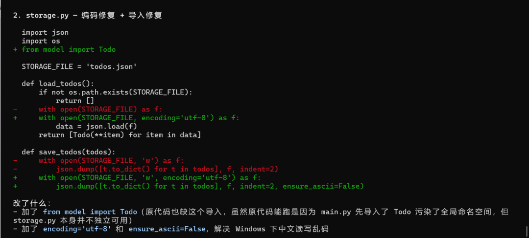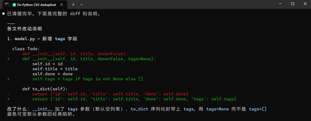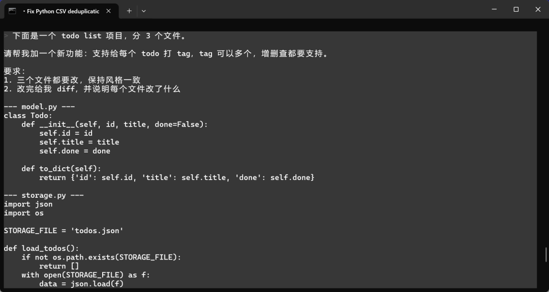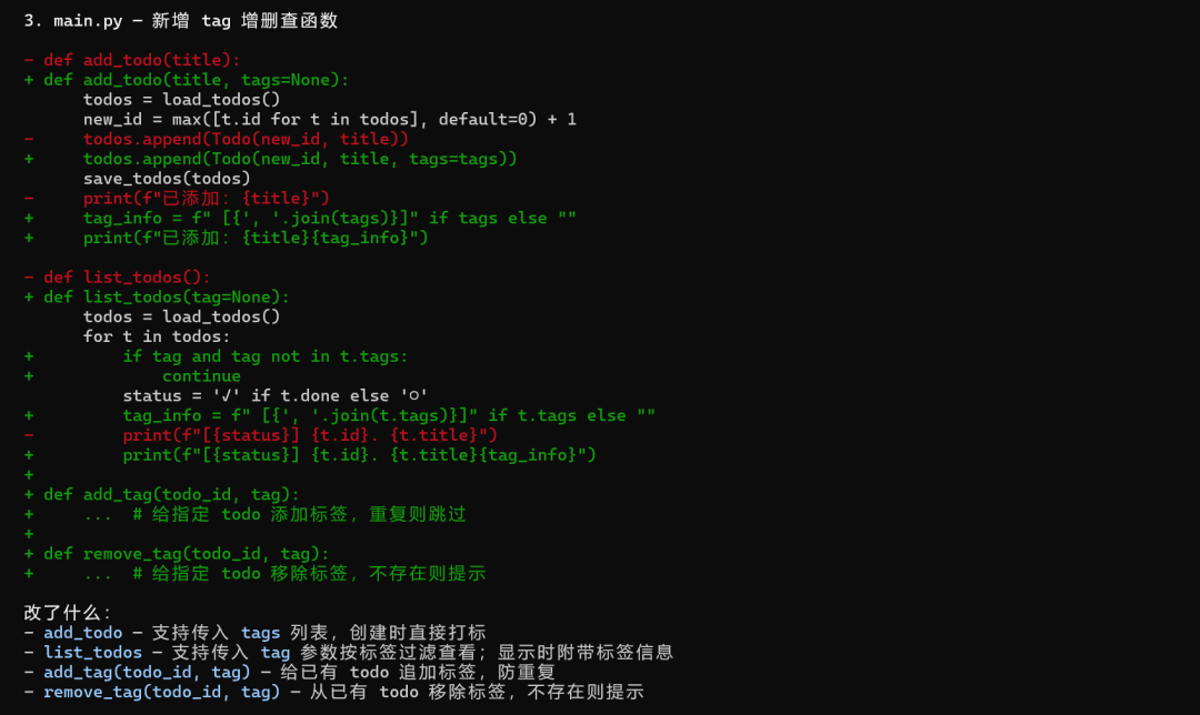 一个分了 3 个文件的 todo list 项目,让它加 tag 功能,三个文件都要改,保持风格一致,输出 diff。