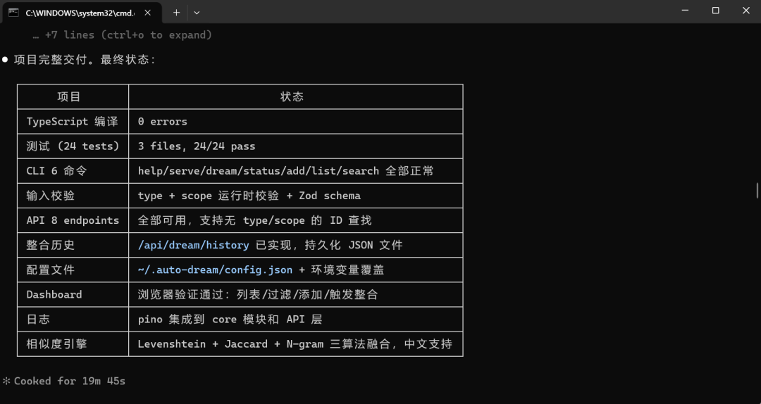 跑完全程没让我补过上下文。中间有一个接口报错,它自己排查改掉了,没有停下来问我。