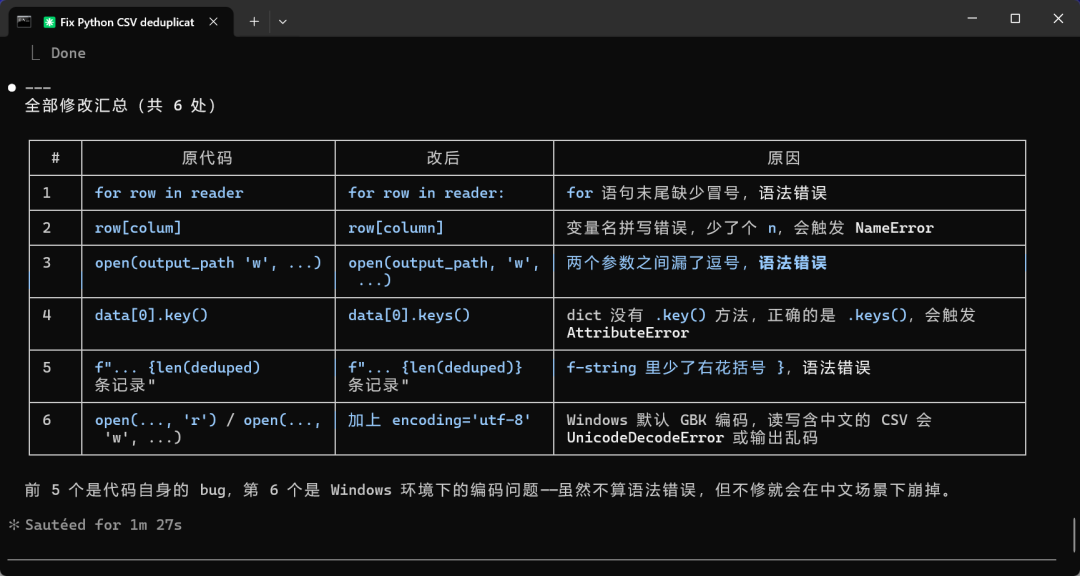 丢给它一段埋了 5 个 bug 的 Python 代码(语法错、变量拼写错、方法名错)。