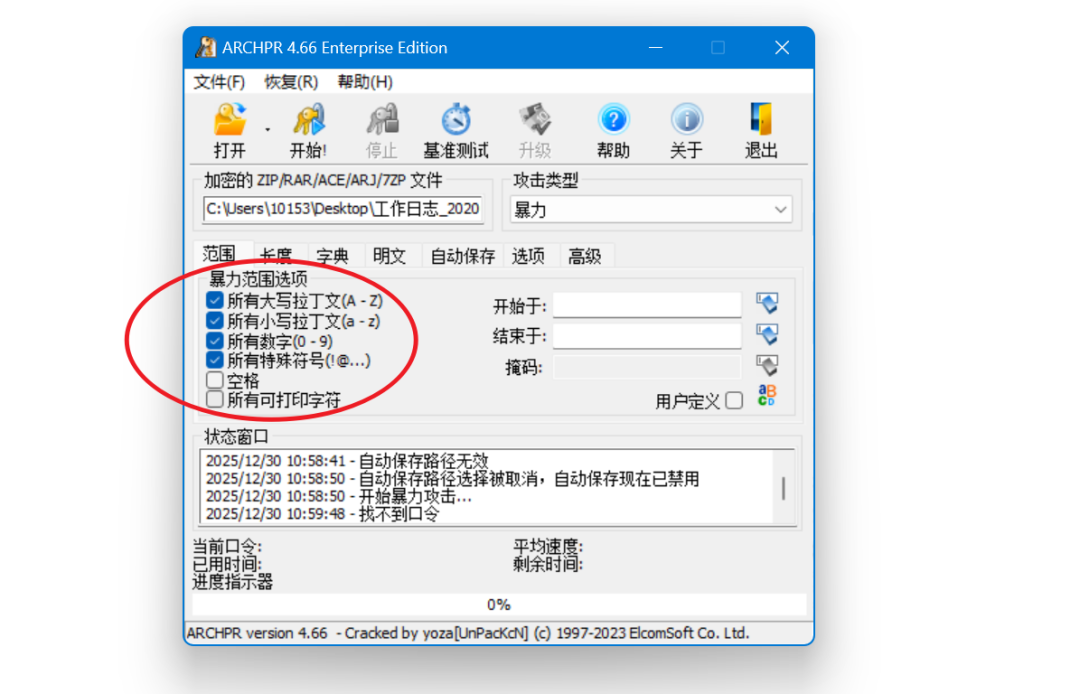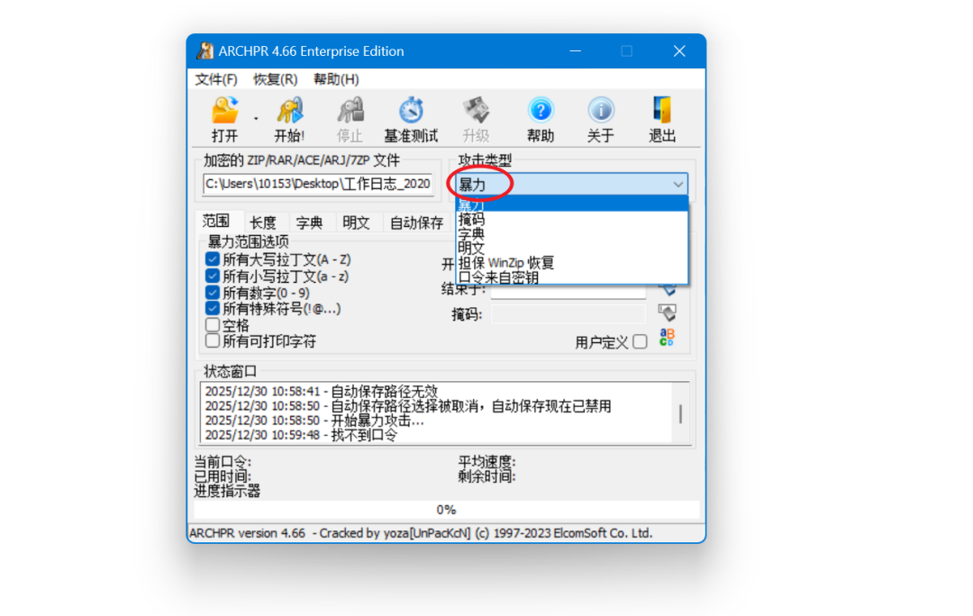 可以看到软件在不断更换密码尝试,其实就是在遍历所有可能的密码组合