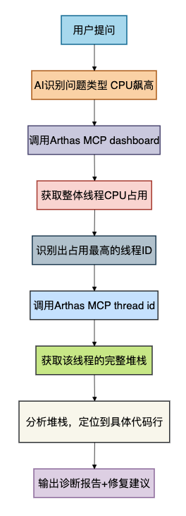 dashboard找高CPU线程 → 4. 记住线程ID → 5. 敲thread 29 → 6. 看到堆栈后,手动分析是哪个类哪一行 → 7. 如果是正则问题,还要去查代码 → 8. 定位到切面 → 9. 修改代码 → 10. 重新发布。每一步都可能因为不熟悉命令而卡住。现在有了Arthas MCP,你只需要说一句话,AI就帮你把前面9步全做了,而且还会给你解释原因和建议。