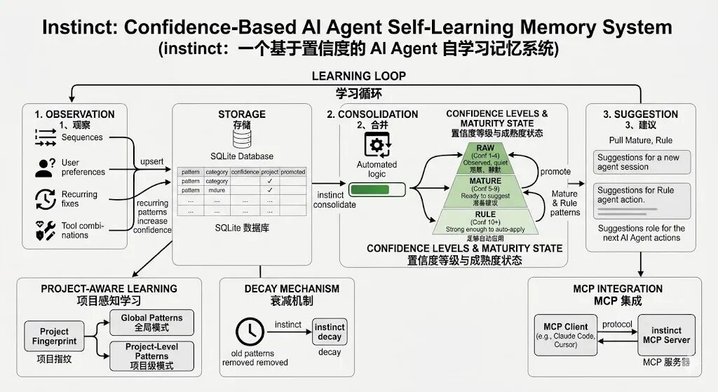 Agent 首次执行某个操作时,instinct 将其记录为一条 raw 观察,初始置信度为 1。同一模式再次出现,置信度递增。当置信度突破第一个阈值,模式进入 mature 状态,就出现在建议列表中;如果获得了更高的阈值,模式晋升为 rule,可以自动应用。