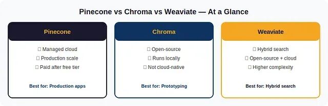 三种选择:Pinecone 用于生产级规模,Chroma 用于本地原型开发,Weaviate 用于混合搜索。