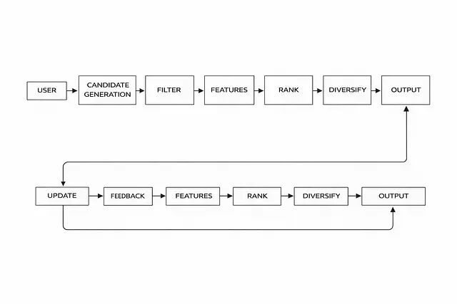 decrease_weight("similarity")用户 → 候选生成 → 过滤 → 特征 → 排序 → 多样化 → 输出 → 反馈 → 更新