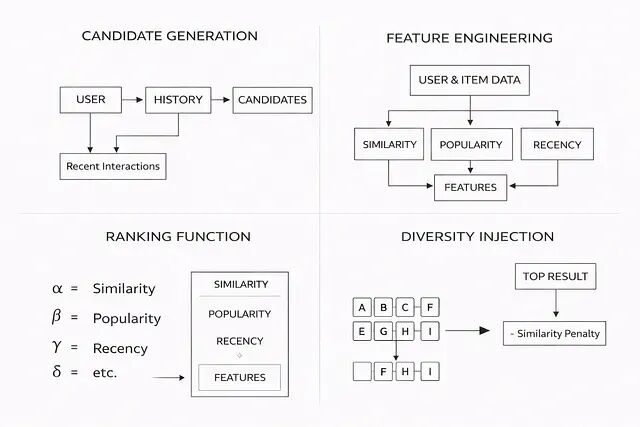 推荐系统不是单一算法而是一条流水线,每个阶段在不同约束下解决不同的问题。多数入门实现把所有事情塞进一步:算相似度。但生产级系统需要做关注点分离,分别管控质量、速度和行为。