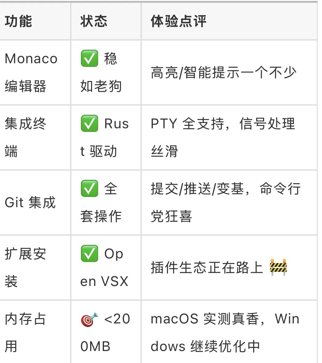 它保留了 VSCode 熟悉的 TypeScript 工作台、编辑器、终端和 Git 集成,但把"重型发动机"Electron 换成了轻量级选手 Tauri(Rust 后端 + 系统原生 WebView)。