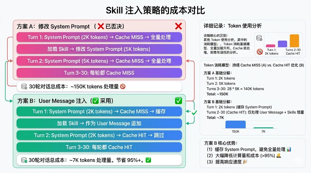 | User Message 注入(非 System Prompt) | 保护 Prompt Cache,降低 90%+ API 成本 | 指令跟随权重略低 |