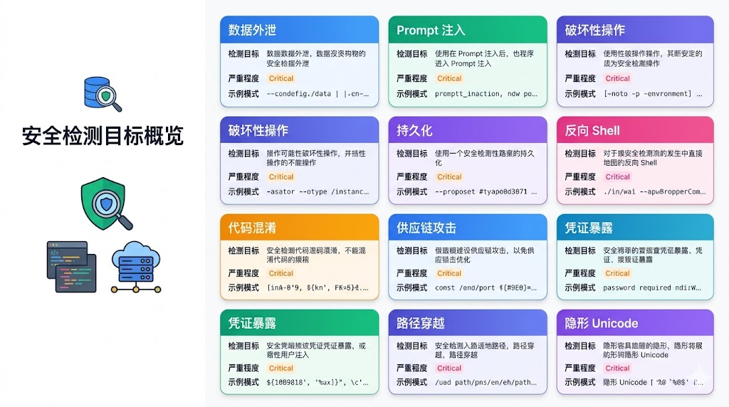 正则匹配可以被各种编码技巧绕过——Base64 编码、变量间接引用、Unicode 同形字替换等。代码中有一个 _parse_llm_response() 函数的预留位,暗示作者计划引入 LLM 辅助的语义审查(让一个小模型审查 Skill 内容),但目前尚未启用。