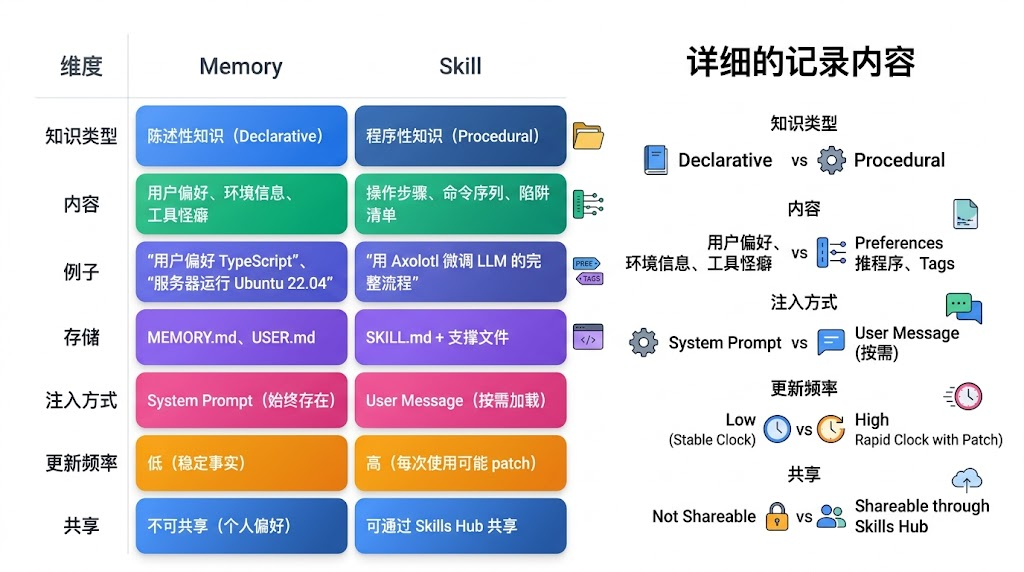 这个分工非常合理。Memory 回答 "是什么",Skill 回答 "怎么做"。 Memory 帮助 Agent 了解用户和环境,Skill 帮助 Agent 执行特定任务。