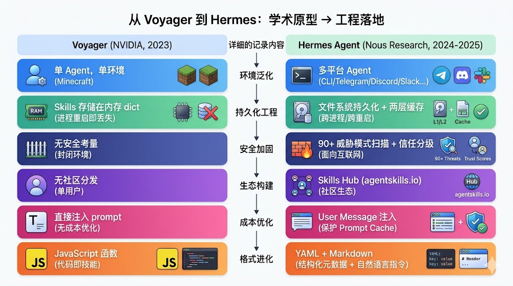 但 Voyager 是一个学术原型,运行在受控的 Minecraft 环境中。Hermes 将这个概念做了完整的工程化落地,面对的是真实世界的复杂性: