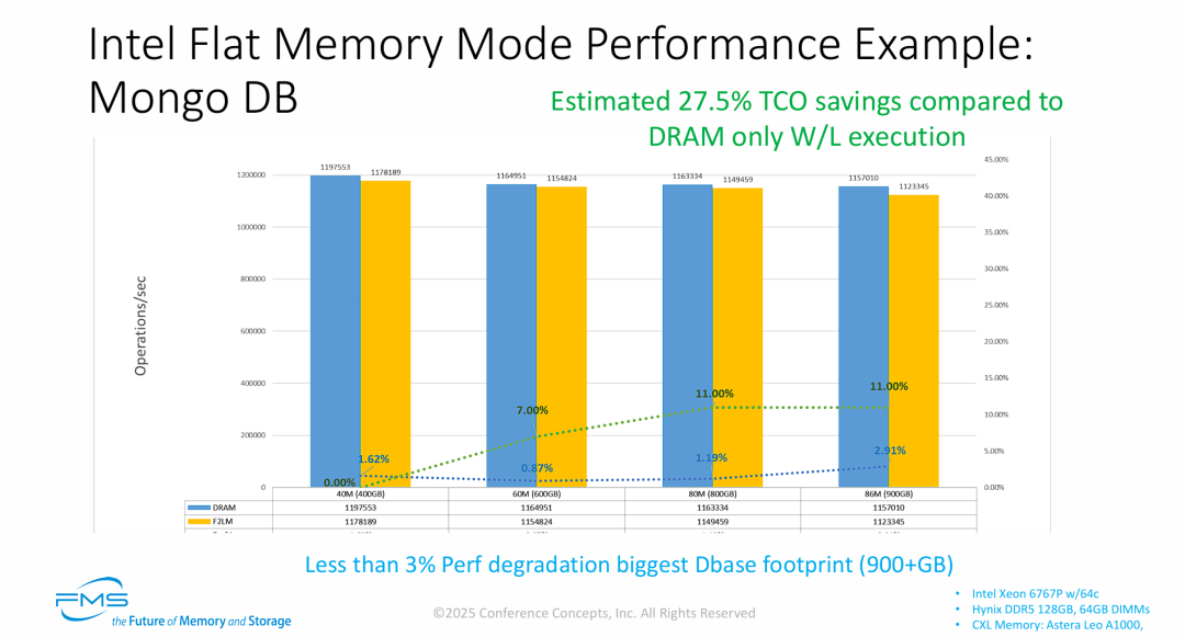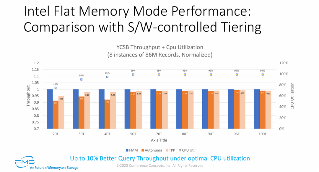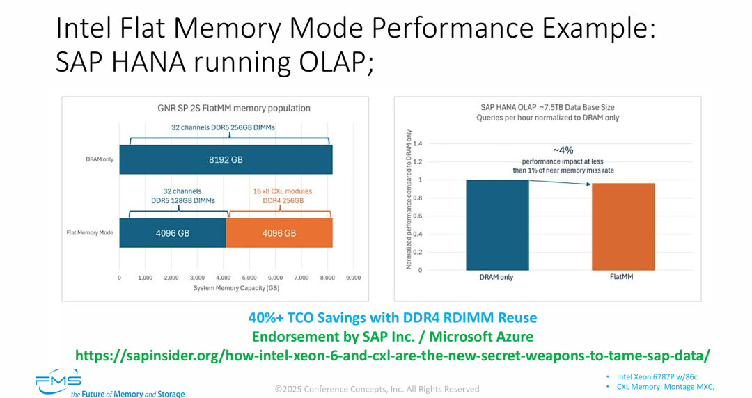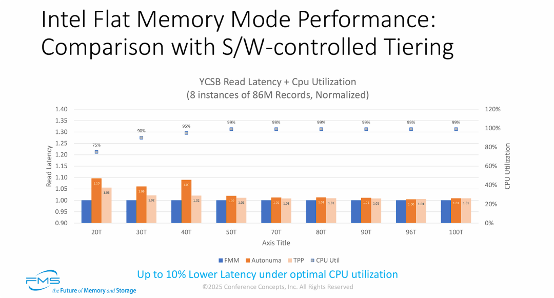 在FMS25存储峰会上,Intel联合多家生态伙伴展示了CXL内存扩展技术的最新商用进展。不同于传统的软件分层方案,英特尔推出的Flat Memory Mode(平坦内存模式)通过硬件级缓存行粒度调度,将CXL远端内存与本地DRAM融合为统一的内存池,在实现7.5TB超大容量的同时,仅带来4%的性能损耗。更关键的是,该方案可为企业节省高达40%的内存采购成本。