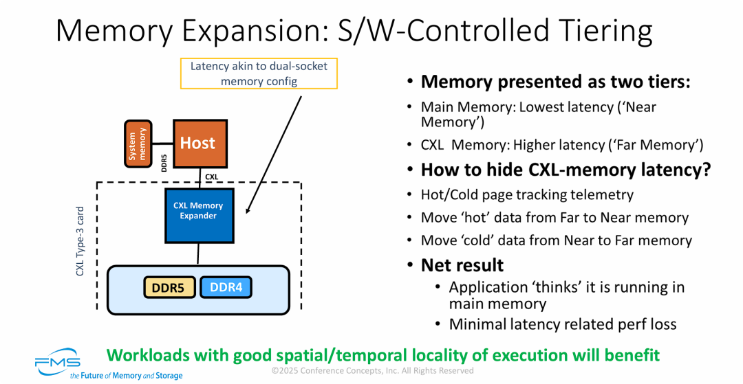 软件定义的冷热数据动态调度是关键: 硬件只是提供了扩展的物理通道,真正让 CXL 内存发挥“类本地内存”性能的核心在于操作系统或 Hypervisor 层的内存页遥测与智能调度算法 。通过后台持续将“热数据”升阶至本地 DRAM,系统在应用无感知的情况下成功“隐藏”了 CXL 的长尾延迟。