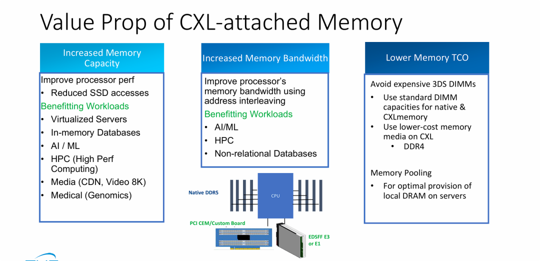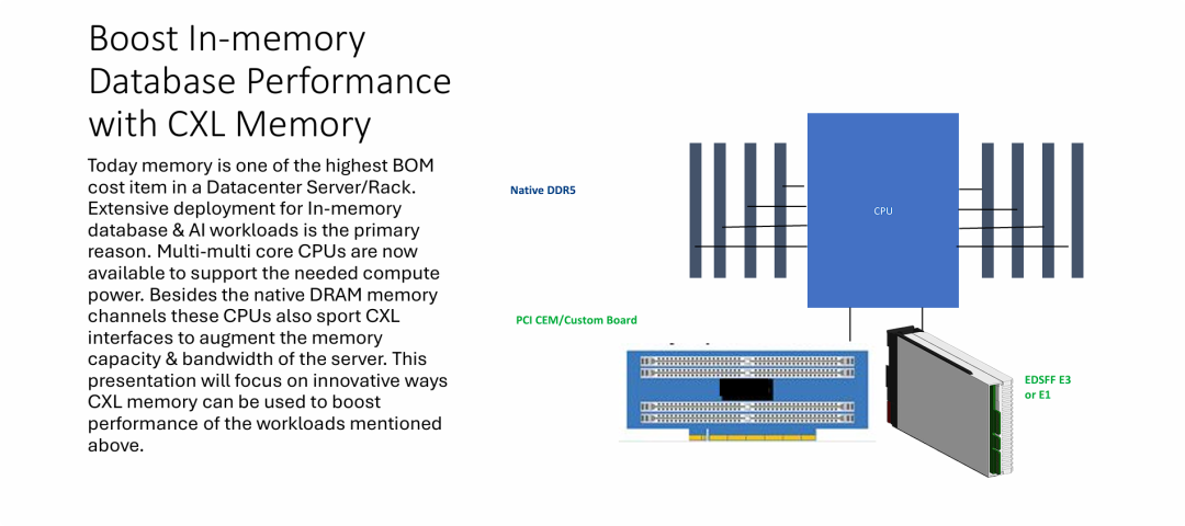 多样化的硬件形态支持(Form Factors): 图片明确展示了 CXL 内存不局限于传统的 DIMM 插槽,还可以采用 PCIe 插卡(AIC) 或 EDSFF(E1/E3) 规格。这意味着数据中心可以像增加硬盘一样,通过机箱前置框架或标准 PCIe 位来灵活增加内存容量。
