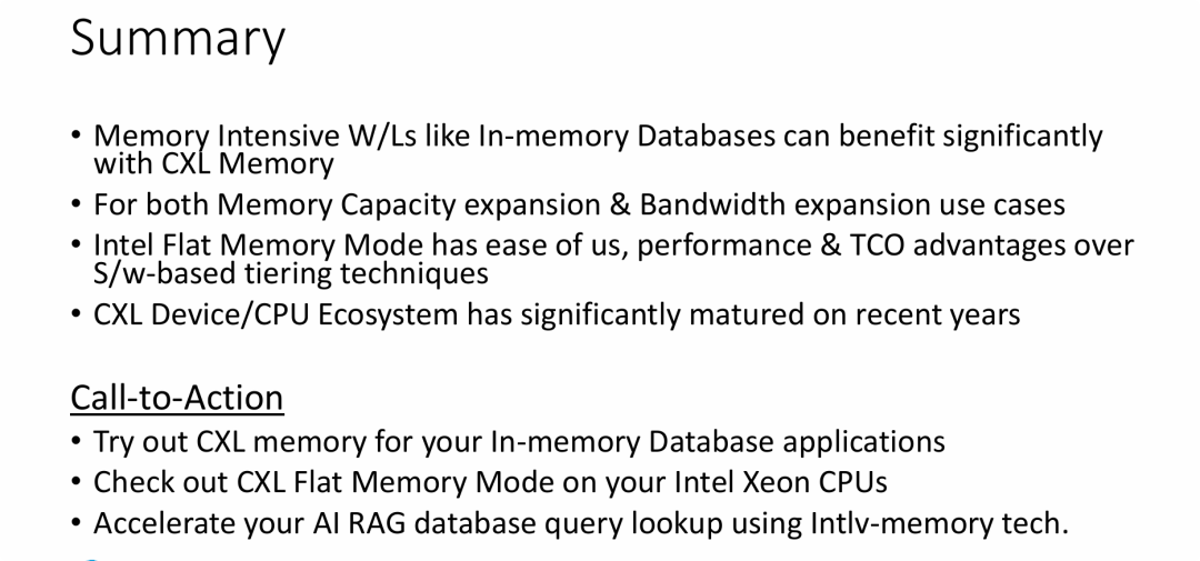 CXL 跨越了“炒作期”,迈入实质性商用阶段: 总结中强调了“生态系统的显著成熟”。结合前面展示的多家厂商(Intel, Astera Labs, Montage, Micron, Hynix)和成熟应用(SAP HANA, MongoDB)的数据,这表明 CXL 已经不再是停留在白皮书上的概念,而是具备了完整的硬件供应链和软件验证,可以直接转化为企业的 TCO 降本工具。