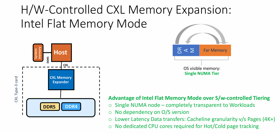细粒度调度大幅降低长尾延迟: 软件分层依赖 OS 移动 4KB 或更大的内存页 (Page),这在应对突发的小数据访问时效率低下且延迟高。英特尔该模式将数据调度的粒度缩小到 CPU 缓存行 (Cacheline) 级别,这种微观层面的硬件级数据搬运,能极其敏捷地响应访问需求,显著降低了数据在 DRAM 和 CXL 远端内存之间移动的延迟开销。