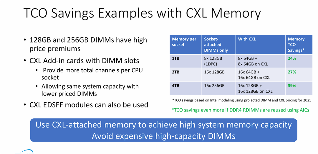 成本结构的重塑(TCO 优化): 这是该图片最核心的商业信息。通过 CXL,企业可以使用多根廉价的标准内存条或上一代介质(如 DDR4)来替代单根昂贵的超大容量 3DS DDR5 内存,从而显著降低硬件成本。