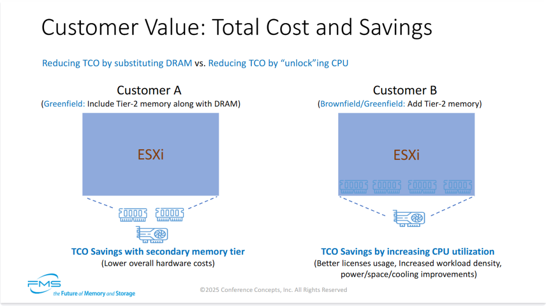 PPT 旨在对比两种通过引入 二级内存层(Tier-2 Memory) 来优化虚拟化环境(以 VMware ESXi 为例)总拥有成本(TCO)的不同策略