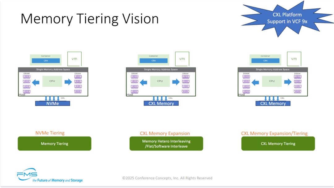 图通过三个阶段的架构图,描绘了内存扩展与分层技术的演进过程,顶部的蓝色星形标注特别强调了 “VCF 9x 版本将支持 CXL 平台”(VCF 指 VMware Cloud Foundation):