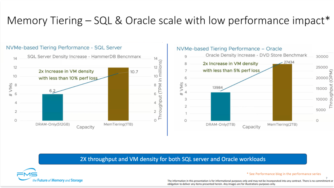 PPT 展示了在两种主流企业级数据库(SQL Server 和 Oracle)下,使用基于 NVMe 的分层内存方案的性能对比: