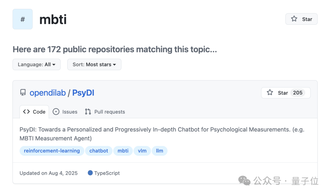 不仅如此,它甚至还在GitHub上带火一些xxTI字辈儿的开源项目,给大家小小科普一下,目前单MBTI topic底下,就有172个公开仓库…