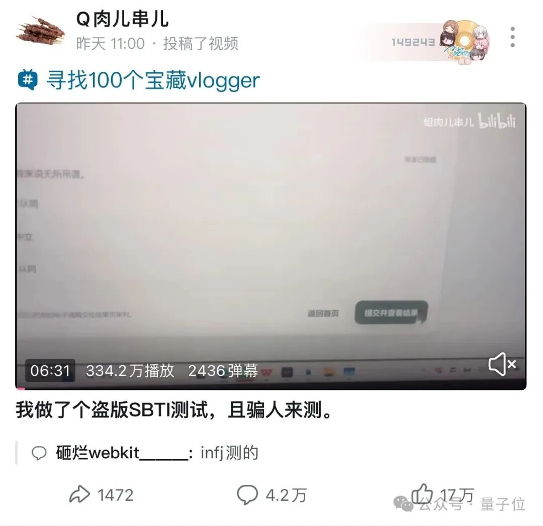 而这风靡全网、火之不能再火的SBTI测试,正是搓自B站UP主Q肉儿串儿之手。