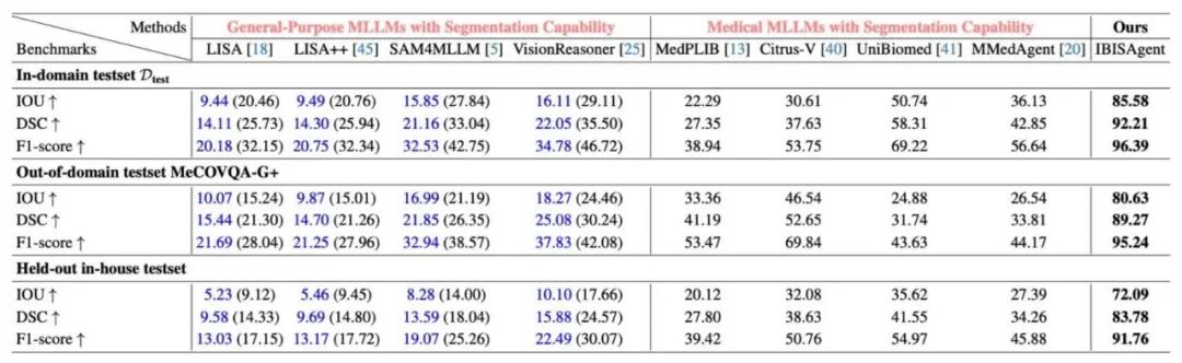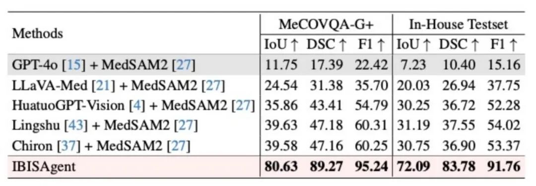 症)三个benchmark上, IBISAgent均大幅领先所有对比方法。相比医学专用MLLM基线,平均 IoU 提升35.13%, DSC 提升 37.58%, F1 提升 29.79%。