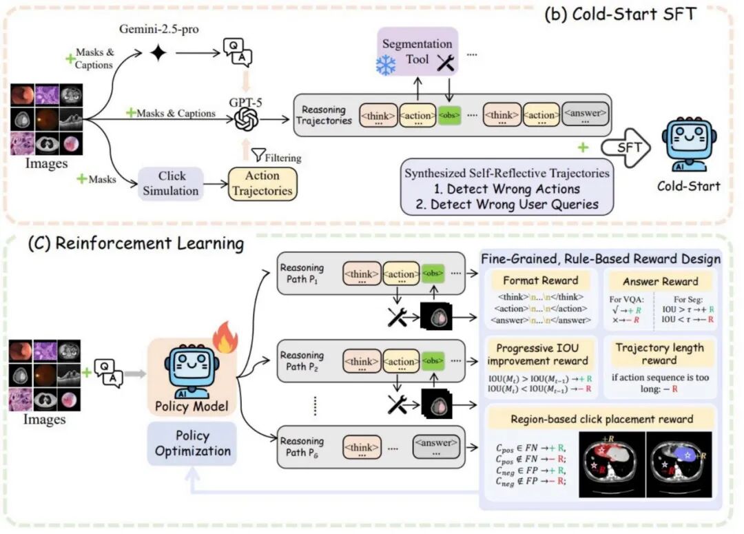 现有生物医学分割数据集只有最终mask,没有逐步点击轨迹。研究团队利用 BiomedParseData(340万图像-mask对, 9种成像模态)开发了自动轨迹生成算法:通过规则化的点击模拟策略自动推导点击序列,再用 Gemini- 2.5-Pro 为每步生成对应的自然语言推理。