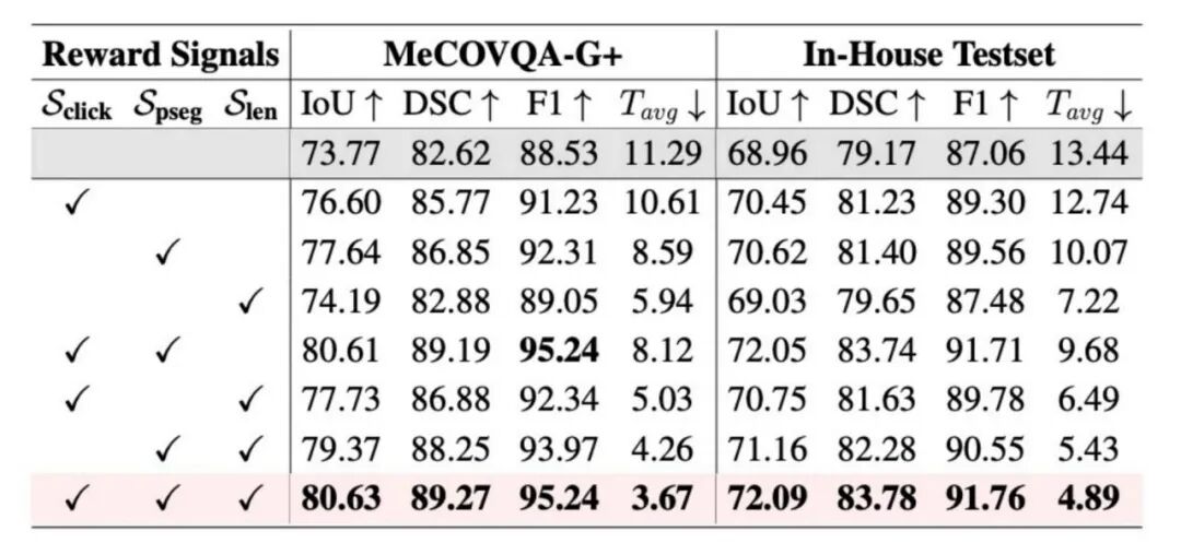 MeCOVQA-G+上的IoU仅为73.77;逐步引入区域点击奖励后, IoU提升至76.60, mask定位准确性显著改善;加入渐进式分割改进奖励后进一步跃升至80.61,同时平均交互步数从11.29步压缩至8.12步,模型学会了更高效的分割路径;最终叠加轨迹长度奖励后,交互效率继续提升,步数降至4.26步,同时分割质量维持在最高水平。这一结果表明,细粒度的逐步反馈信号是驱动模型在质量与效率之间取得最优平衡的关键,单纯依赖最终结果奖励无法达到同等效果。