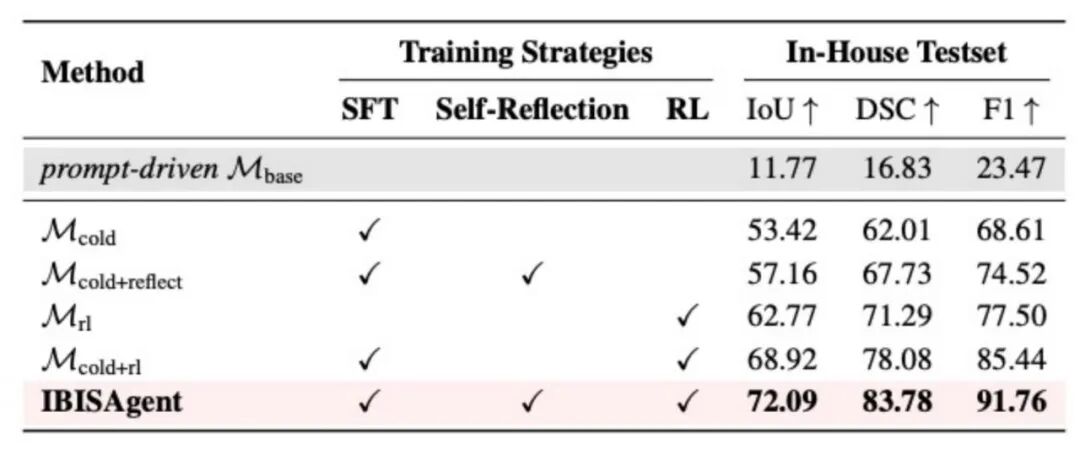 值得注意的是, Citrus-V 和 UniBiomed 均在比本方法更大规模的数据集上训练, IBISAgent仍能一致超越,说明性能提升来自方法设计本身,而非数据优势。