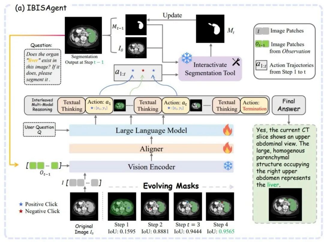 该研究将生物医学图像分割从"单次推理输出"推进到" 自主多轮交互决策"。