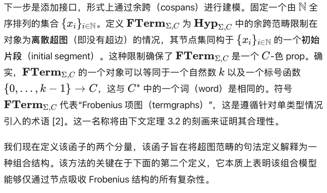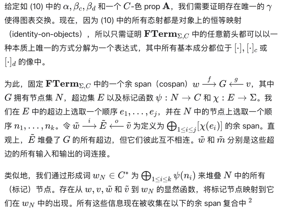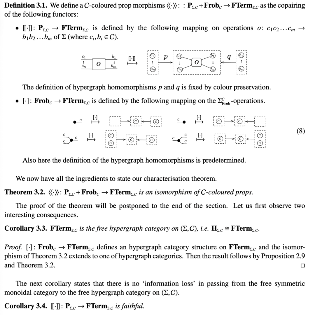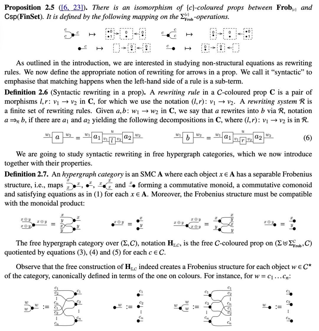 关于弗罗贝尼乌斯结构的重写,[2, 3] 已沿着相同的思路进行了研究。这些由作者及其合作者近期完成的工作,为本文提供了路线图:本文旨在验证此类结果可推广至多类代数理论,其中自由生成的范畴在每个类上都具有一个弗罗贝尼乌斯结构。根据[2, 3]的启示,这一推广的展开方式并不特别令人惊讶,因为我们基本上能够将相同的证明技术从单类情形提升至多类情形。然而,我们认为,为这些结果撰写一篇参考性论文的时机已经成熟。首先,这得益于人们对超图范畴重新燃起的兴趣,这一点从近期若干应用中得到印证,特别是在电路理论[15]和自然语言语义学[26, 19]方面:使用[2, 3]中发展的理论将需要多类情形下的完全一般性。其次,另一个理由来自于对各种系统族(并发系统[7]、量子系统[10]、动力系统[4, 1])的公理化方法,其中公理化系统行为的等式理论包含两个或更多弗罗贝尼乌斯代数。在重写方面,[2]中引入的方法仅允许在组合模型中吸收一个弗罗贝尼乌斯结构。在本文中,我们展示了如何以相同方式吸收额外的弗罗贝尼乌斯结构1,从而降低上述公理化方法的复杂性,并简化研究范式、合流性和终止性的任务。