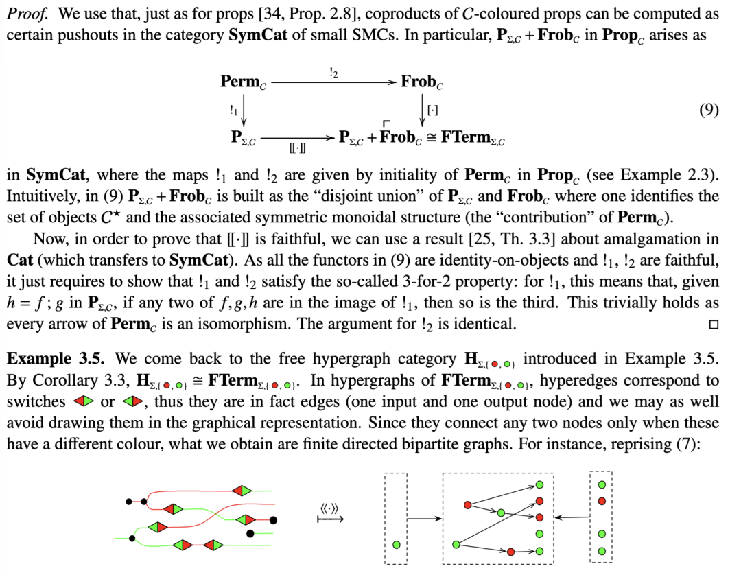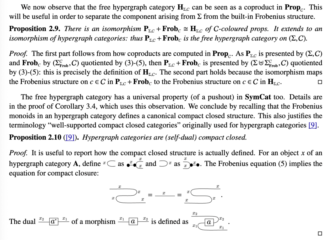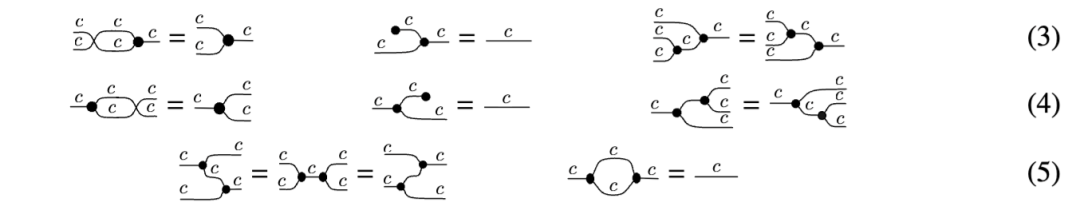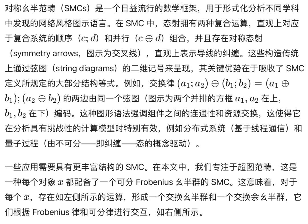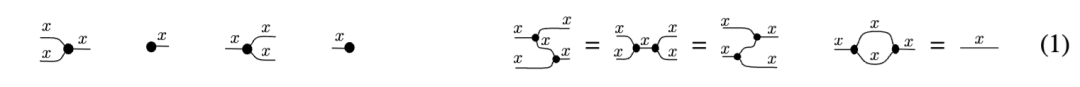 核心直觉是,这种额外的结构允许弦图的悬垂线(dangling wires)进行分叉、被丢弃、被移动到左/右侧,从而使得对所表示系统的接口(变量、存储单元)的操作更加灵活。将超图范畴用作计算的代数方法是由 Walters 及其合作者 [9, 20] 开创的,当时使用的名称是“良支撑紧致闭范畴”(well-supported compact closed categories)。从那时起,可分 Frobenius 幺半群普遍出现在不同研究线索的图示演算中。它们显著地出现在 ZX 演算 [10](量子理论)中,其中每个 Frobenius 结构在量子可观测量方面都有精确的物理意义。Frobenius 幺半群也构成了无状态连接器演算 [7]、信号流图演算 [4, 5]、Baez 的网络理论 [1] 以及 Pavlovic 的幺半计算机 [28] 的骨干。最近,人们特别关注通过跨(span)、关系(relation)及其对偶的抽象概念来通用地构造超图范畴 [35, 15, 26, 16]。